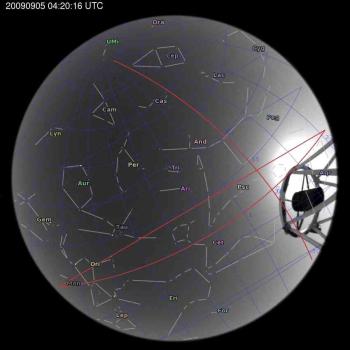 Annotated all-sky camera image from La Palma observatory taken on 2009-09-05 at 04:20:16 UT