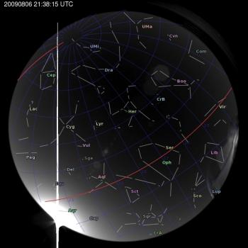 Annotated all-sky camera image from La Palma observatory taken on 2009-08-06 at 21:38:15 UT