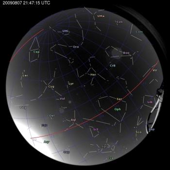 Annotated all-sky camera image from La Palma observatory taken on 2009-08-07 at 21:47:15 UT