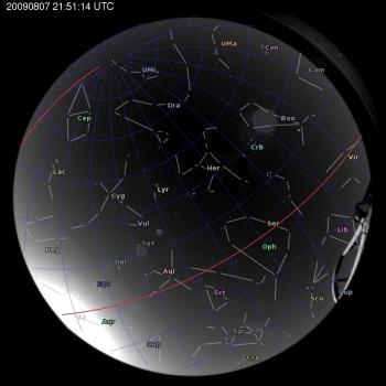 Annotated all-sky camera image from La Palma observatory taken on 2009-08-07 at 21:51:14 UT
