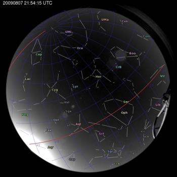 Annotated all-sky camera image from La Palma observatory taken on 2009-08-07 at 21:54:15 UT