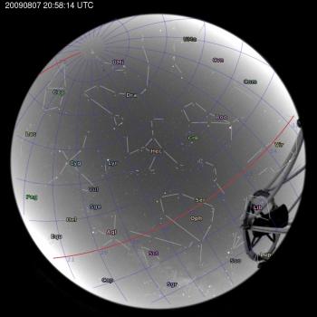 Annotated all-sky camera image from La Palma observatory taken on 2009-08-07 at 20:58:14 UT