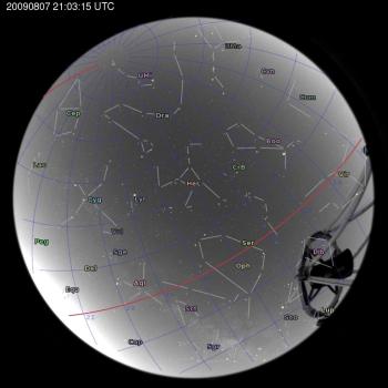 Annotated all-sky camera image from La Palma observatory taken on 2009-08-07 at 21:03:15 UT